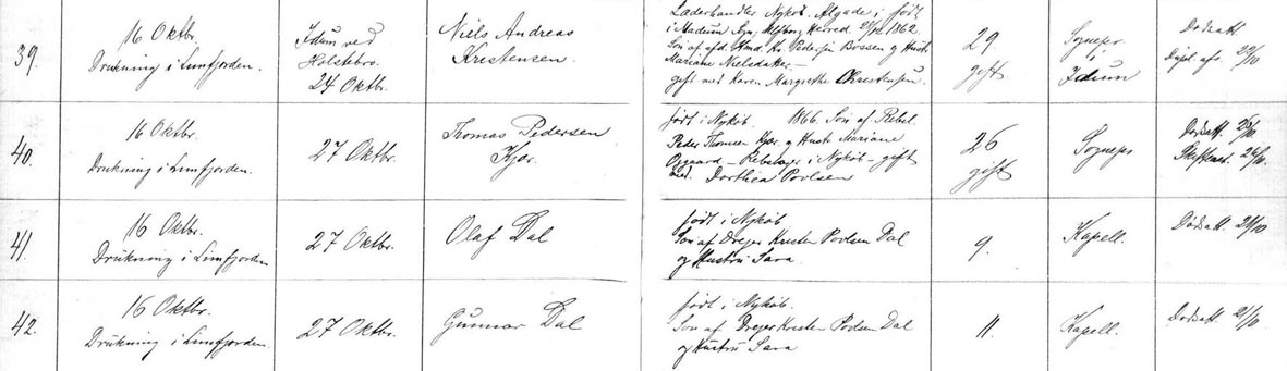 I Nykøbing Mors kirkebog kan man se, at læderhandler Kristensen, Thomas Pedersen Kjær og de 2 af Kristen Poulsen-Dahls sønner blev fundet kort efter ulykken, og alle 4 blev begravet den 27. oktober. Manufakturhandler Anders Madsen blev fundet efter en månedstid, den 25. november og begravet 2 dage senere. Så gik der små 14 før det næste lig dukkede op, nemlig Kristen Poulsen - Dal, der blev fundet på Aasted Forstrand den 2. december og begravet den 7. december. Et par dage efter, blev læderhander Christensens kone, Karen Margrethe, fundet. Hun blev begravet den 16. december.