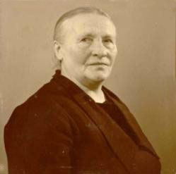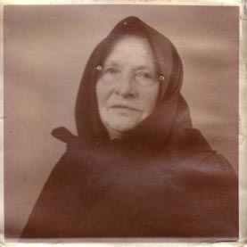 oldemor som en meget gammel kone, siddende på en stol, altid klædt i sort og med tørklæde