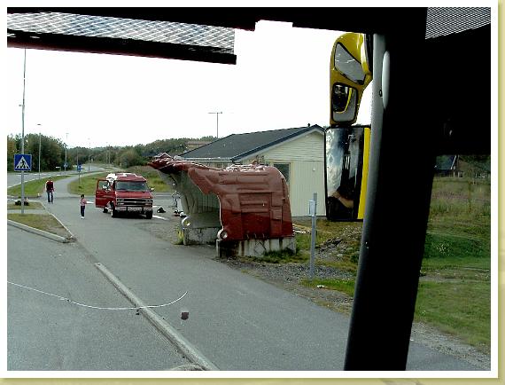 Gravemaskinens skovl er brugt som vandalsikret busskur | ![]() |
